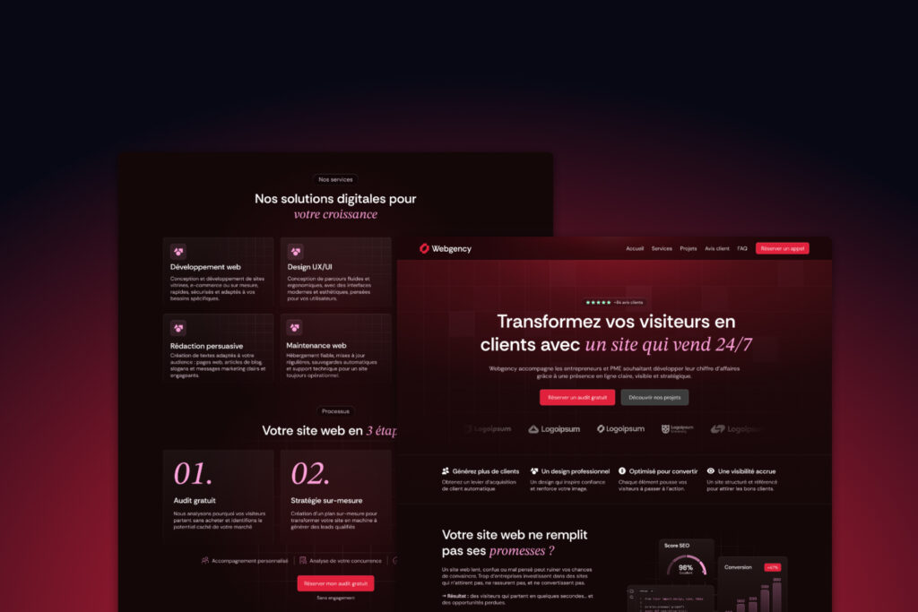 Chez Webgency, on conçoit des sites qui captivent dès la première seconde, pensés pour guider vos visiteurs jusqu’à l’action. Chaque détail est optimisé pour transformer l’attention en conversion.